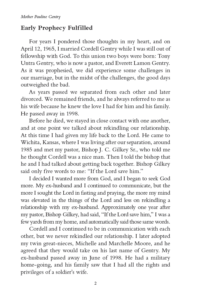 “Mother Pauline Gentry is a modern day Deborah, willing to tackle any obstacle with the weapon of prayer. She is a living testimony of how the Lord has worked miracles as she dedicated her life to consecration and prayer.”