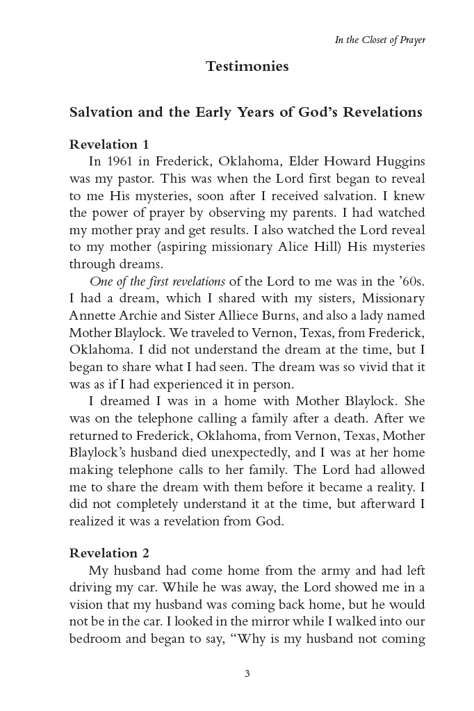 “In the Closet of Prayer is a book written by Evangelist Pauline Gentry, filled with life changing Spiritual revelations and prophesies. It is perhaps one of the best and most authentic books on the market today with a unique compilation of Miraculous testimonies from real people, by name, in real time. These testimonies give a glimpse of the incredible mysteries of God. The author is uniquely gifted to pray, see Spiritual visions and dream dreams of things and events to come. It is a must read, particularly for those seeking healing and deliverance from depression, addictions etc.”