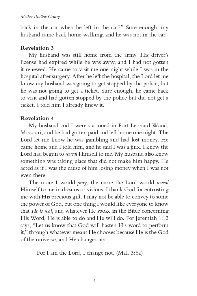“Mother Pauline Gentry has been proven in prayer. In reading this book your prayer life will soar to new heights; seeing that breaking through barriers, Demonic forces, and pulling down strong holds are possible. This book is a must read.”